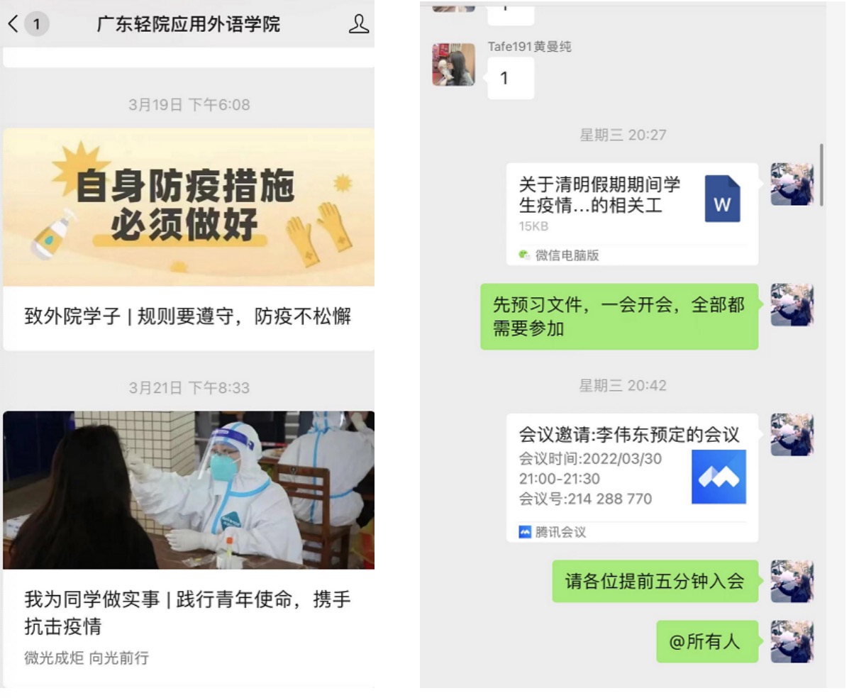 一是强化宣传引导。一是师生党员充分运用各班级微信群以及学院微信公众号等渠道做好线上宣传,及时传达学校疫情防控工作精神,教育引导广大学生深刻认识此次疫情防控形势的严峻性,坚决克服麻木思想和侥幸心理。