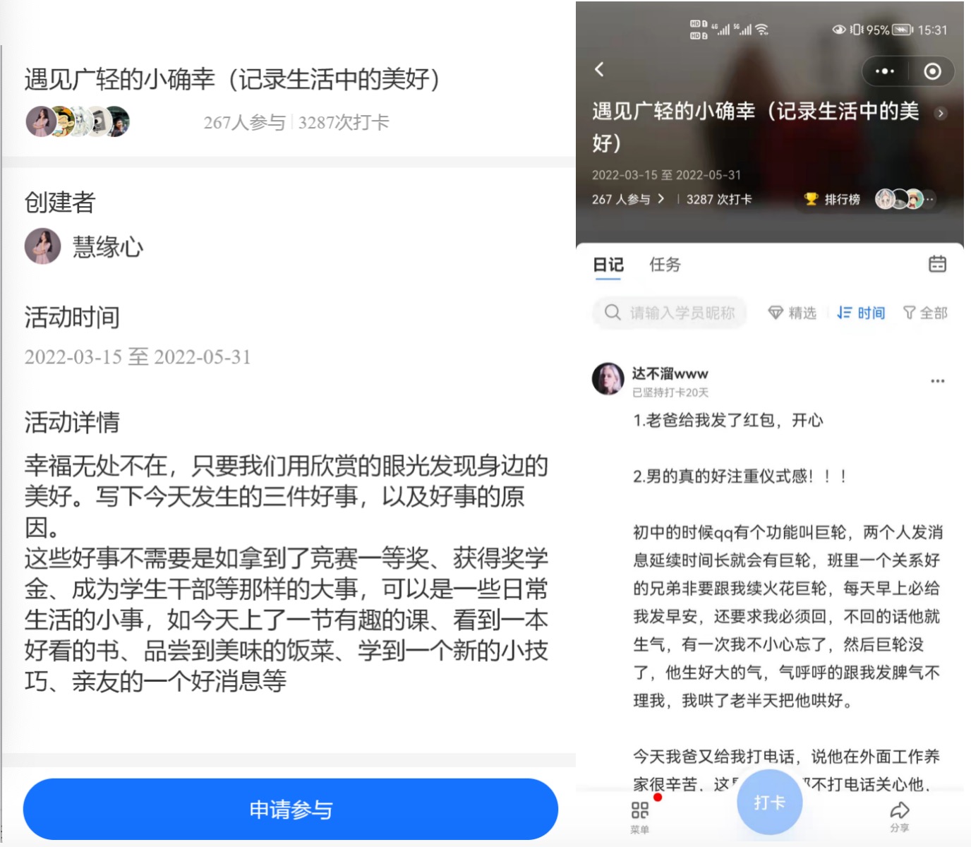 (二)强化关爱帮扶。深化“我为群众办实事”实践活动,及时了解学生诉求,协调解决矛盾问题。一是开展心理疏导活动。进一步提高学生心理健康工作针对性和有效性,扎实做好校园疫情防控下高校学生心理健康教育工作,发挥党员心理委员的主心骨作用,举办"护心防疫 心成长"心理委员专题培训会;举办“遇见广轻小确性”打卡活动,发现平凡生活中的小美好,每天记录生活点滴,累计参与人数三千余次;成立针对隔离和暂缓返校学生的党员心理工作小组,一对一进行情况跟进,对学生开展心理疏导,帮助其解决隔离期间的各种心理困难,确保学生以积极的心态平稳度过隔离期。