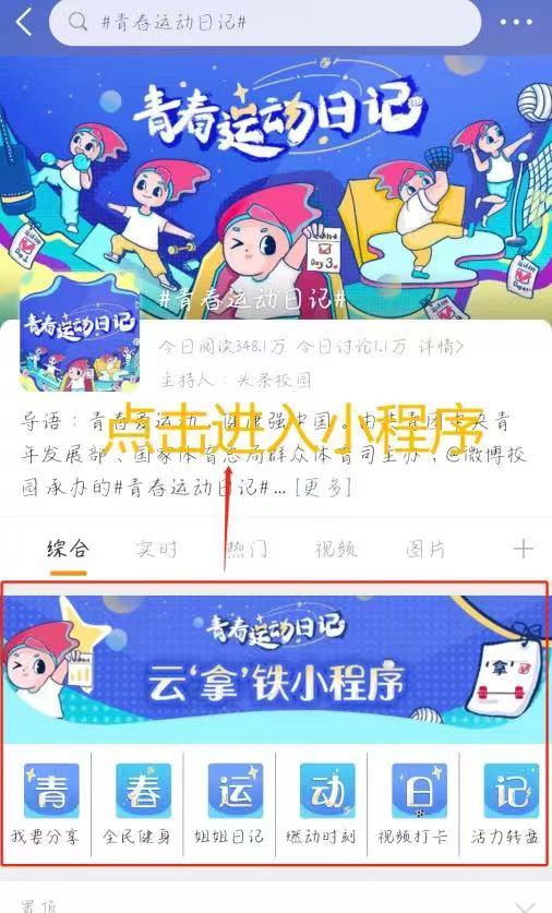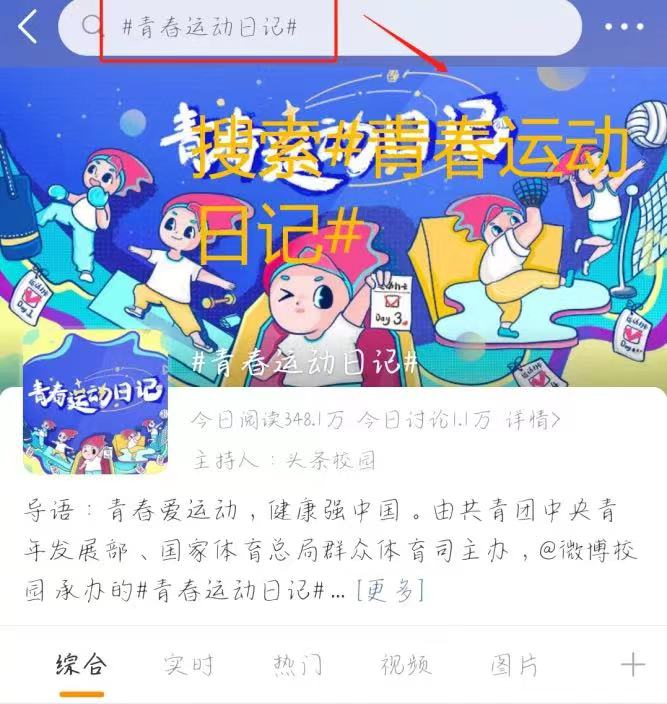 方式二:打开微博客户端,搜索话题词“#青春运动日记#”,在话题词首页点击“青春爱运动 健康强中国”卡片进入活动页面。