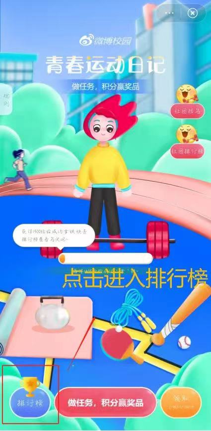 积分查询步骤:1.进入微博——发现搜索#青春运动日记#