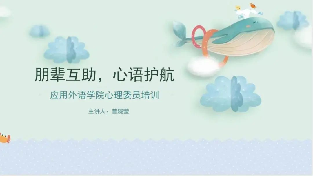 本次心理委员培训由应用外语学院二级心理辅导员曾婉莹老师主讲,本次培训主要从心理委员的定位,心理委员的工作职责,心理委员的自我修养,心理问题的分类和心理危机的识别四个方面展开。