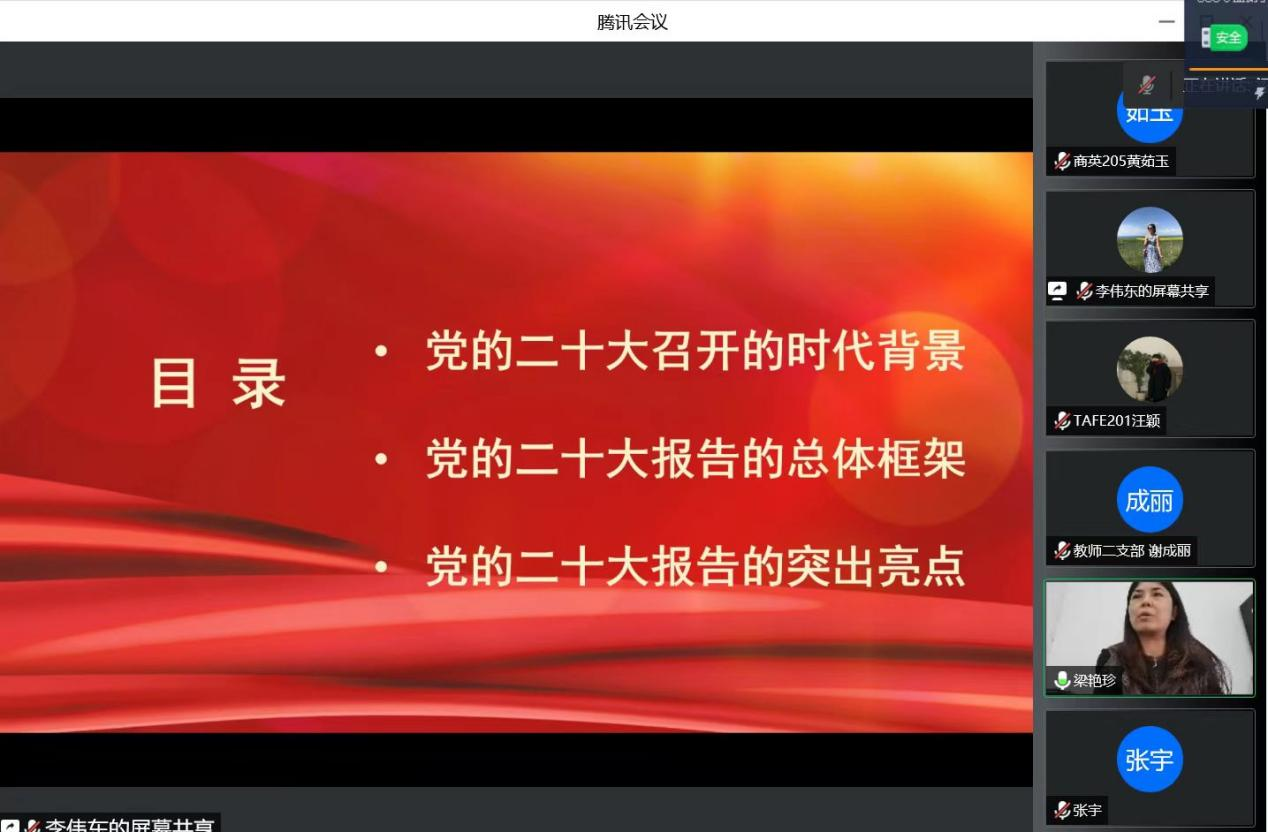 为深入学习宣传贯彻党的二十大精神,切实将思想和行动统一到党的二十大精神上来,把力量凝聚到党的二十大部署的各项目标任务上来,12月13日下午,学校党委副书记梁艳珍在线上参加了应用外语学院学习党的二十大精神专题学习会。应用外语学院教师第二党支部和学生党支部全体师生参加了会议,会议由应用外语学院学生党支部书记李伟东主持。