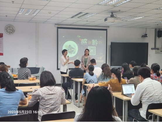 2023年5月23日下午,应用外语学院党总支和学院分工会邀请咿述香气空间创始人程琦女士,在新港校区B803举办食疗美容与营养搭配专题讲座活动。学院党总支书记周延辉、院长章国军、分工会全体成员及学生代表参加了本次讲座。
