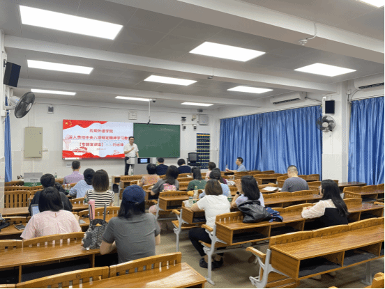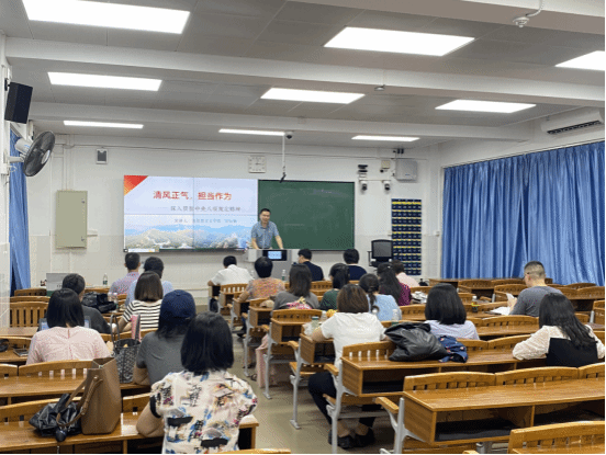 为深入贯彻中央八项规定精神学习教育,持续推进党风廉政建设,提高党员教师的政治素养和纪律意识,应用外语学院特邀马克思主义学院刘远锋老师于6月27日下午在教学楼203开展了一场主题为《清风正气,担当作为 —— 深入贯彻中央八项规定精神》的专题宣讲会。应用外语学院党总支副书记张炜斌主持,学院全体党员教师参加了此次活动。