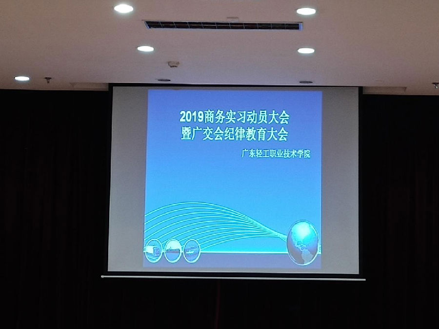 2019年3月26号晚上,我院来自商务英语专业和商务日语专业的全体大二学生参加了我校在广州校区第二工业实训楼B903举办的“2019商务实习动员大会暨广交会纪律教育大会”。我院分团委书记曾小娟、商务英语教研室主任项伟峰、商务英语专业刘福英老师、谢成丽老师、贾少宁老师以及邓卫华老师等出席了本次大会。