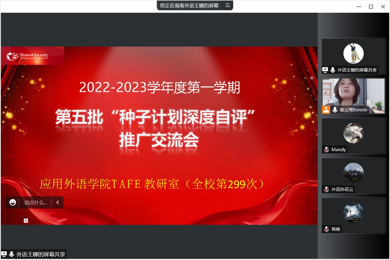 2022年12月13日至27日,我院国际商务、大学英语、应用英语、商务外语、商务英语等教研室分别召开了线上第五批“种子计划、深度自评”推广交流会”,会议主要由各教研室主任担任主持,全体教研室老师参加会议,学校督导室徐国良教授出席会议。