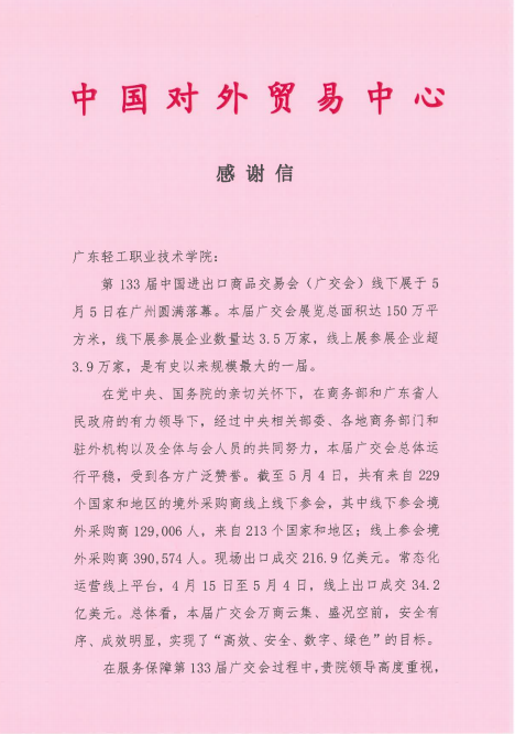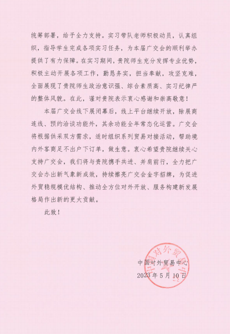 5月11日,中国对外贸易中心向我校发来感谢信,感谢我校在第133届广交会给予的大力支持,对我校师生在广交会的工作表现予以高度认可和感谢,并表示继续加强双方合作。