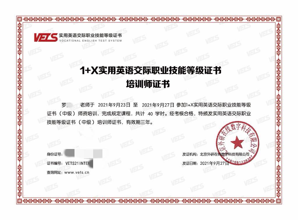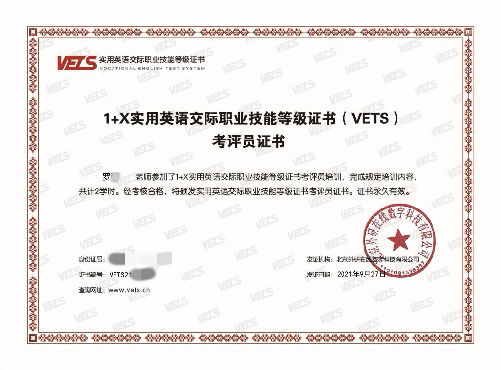 实用英语交际职业技能等级证书(简称VETS)是教育部职业技术教育中心研究所受权发布的“1+X”职业技能等级证书,也是目前外语类唯一一个X证书,由北京外研数字在线科技有限公司研制,对接国际专业标准,注重语言能力与职业能力的全面融合,满足各行各业、各级各类工作领域对技术技能人才国际化水准的需求,是职业院校有效提高人才培养质量、提升学生就业竞争力的评价体系,并已纳入教育部第四批“1+X”证书制度试点。