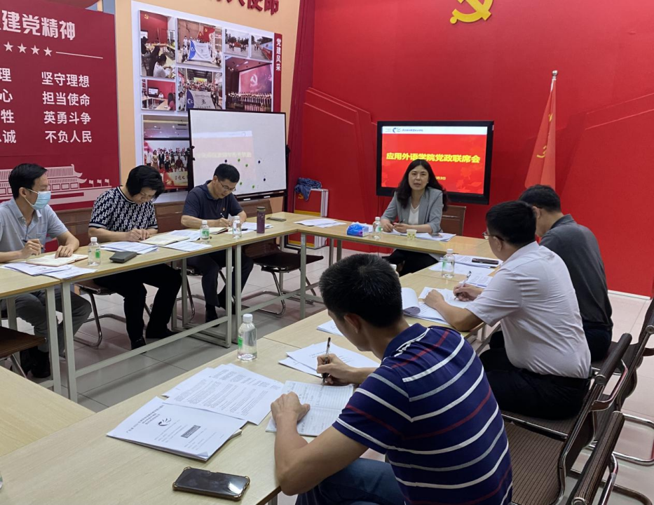 会议由应用外语学院党总支书记周延辉主持,学院领导班子成员以及相关部门负责人参加了会议。梁书记在认真听取了学院近期工作汇报后,对学院在党建工作和教学管理方面取得的成绩给予了充分肯定。