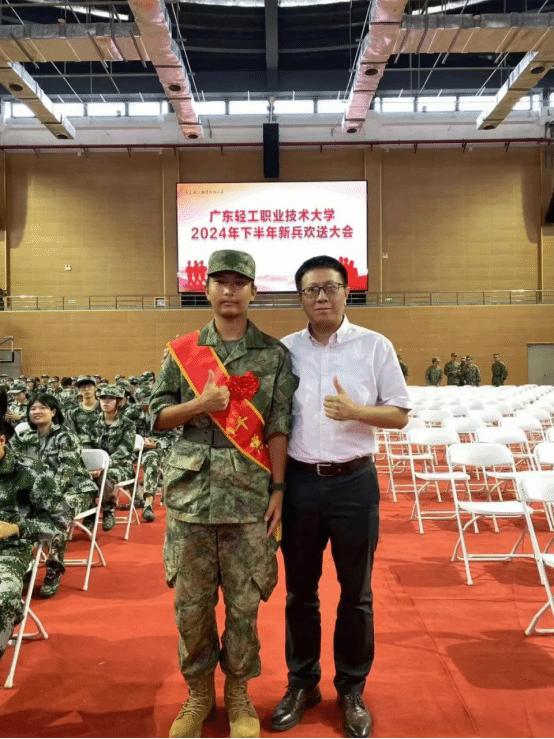 2024年9月14日,广东轻工职业技术大学举行了一场庄重而热烈的2024年下半年新兵欢送大会,欢送即将踏上军旅征程的新兵们。其中,我院应用英语221班的张正阳同学身着戎装,英姿飒爽,光荣入伍,成为众多新兵中的一员。