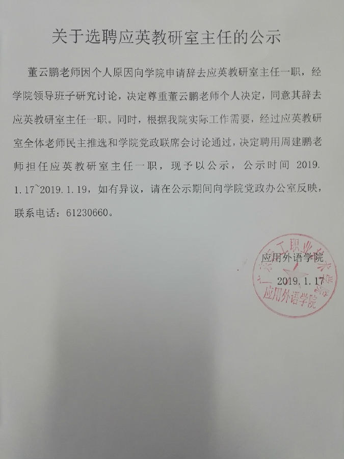 关于选聘应英教研室主任的公示