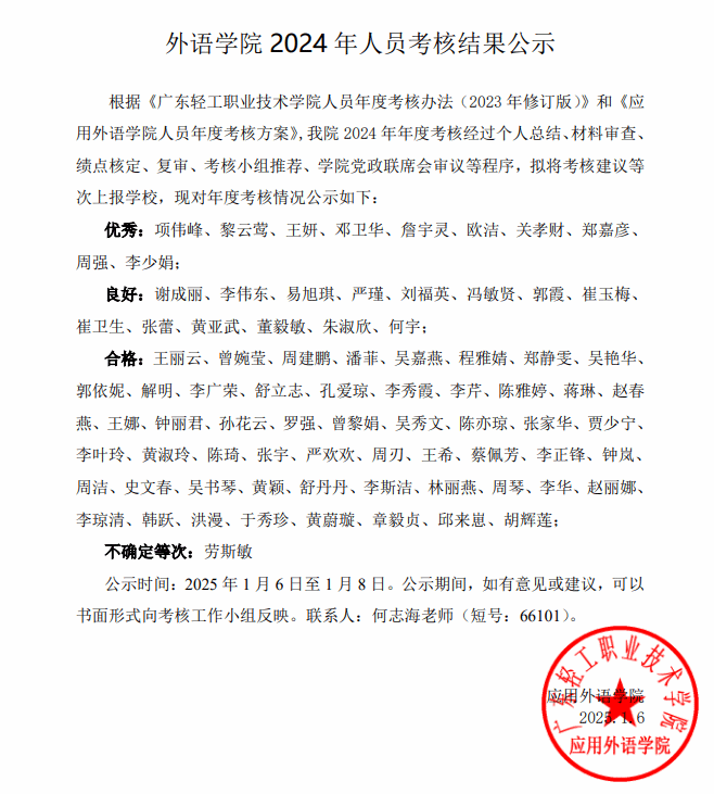 应用外语学院2024年人员考核结果公示