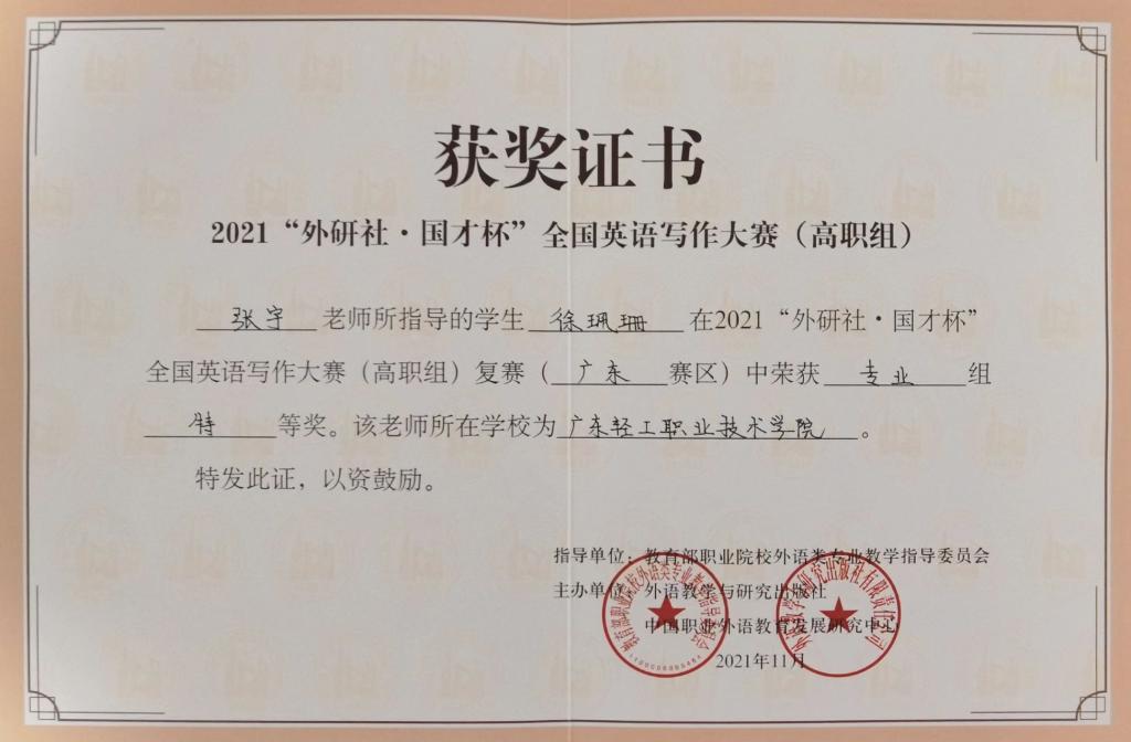2021全国英语写作大赛(高职组)省赛特等奖