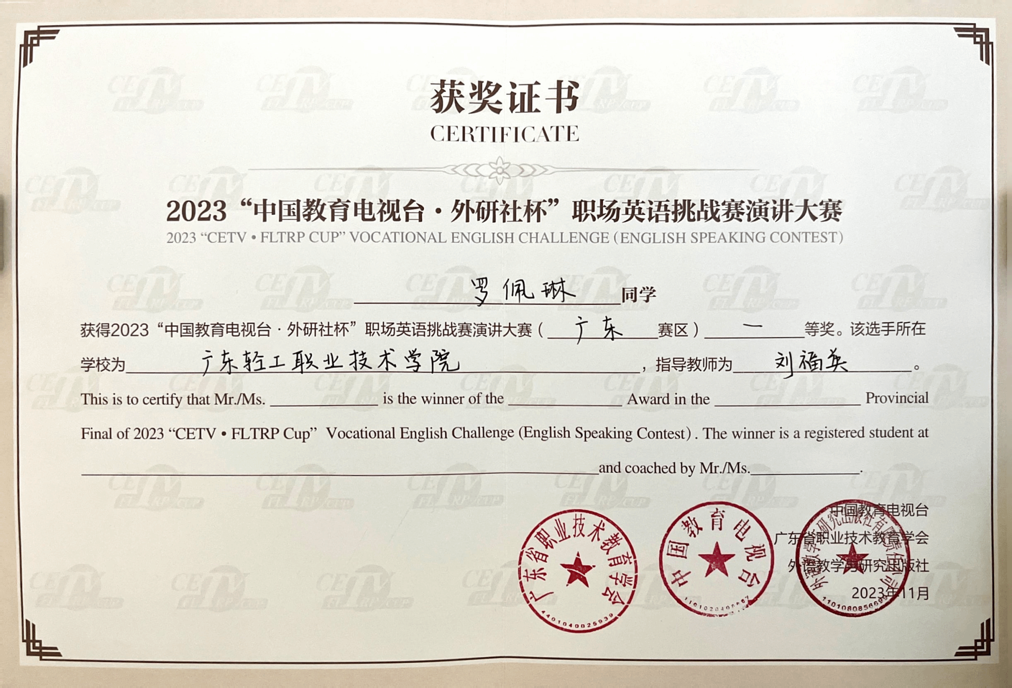 2023“中国教育电视台·外研社杯”职场英语挑战赛演讲大赛省一等奖