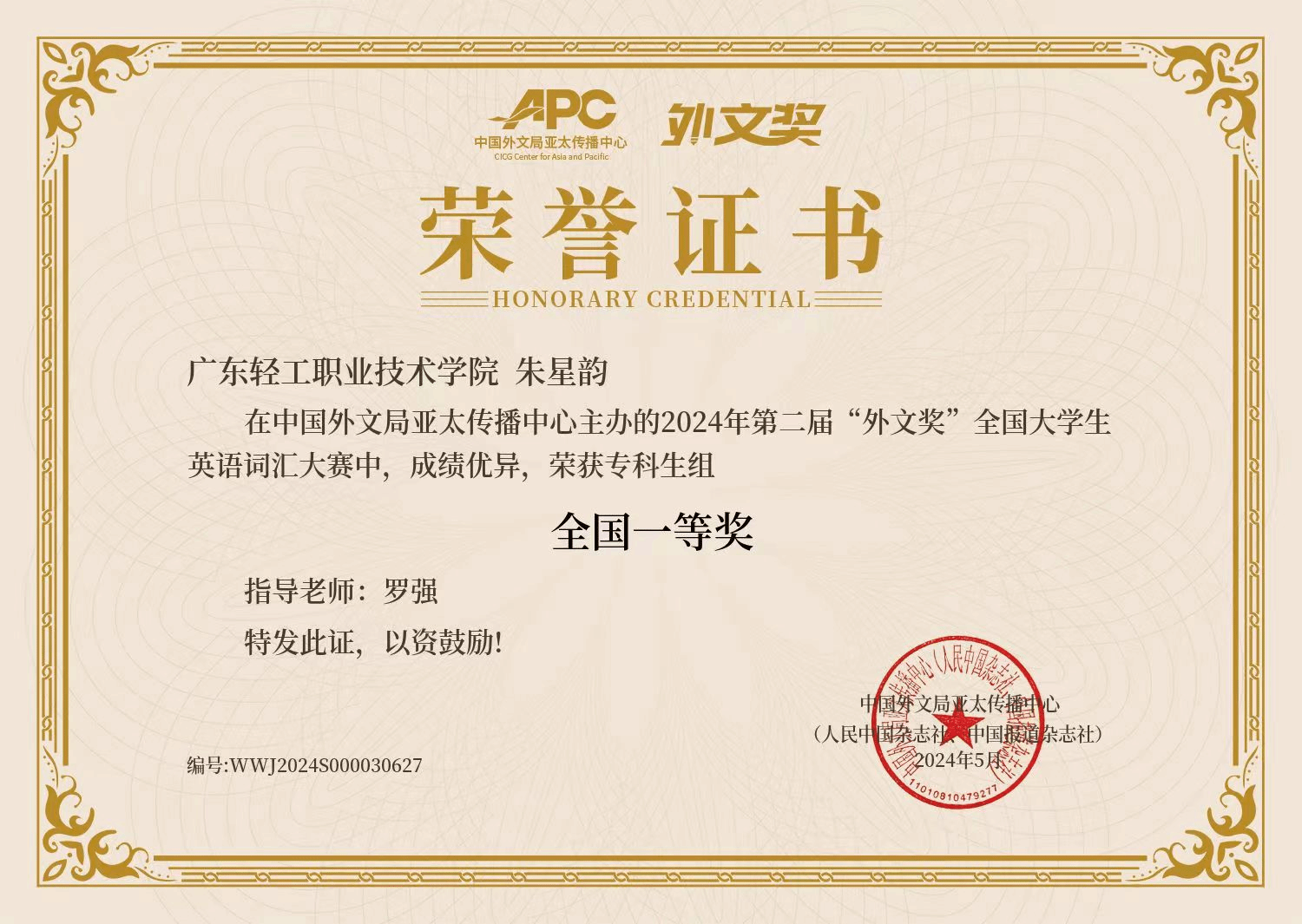 2024年第二届“外文奖”全国大学生英语词汇大赛一等奖
